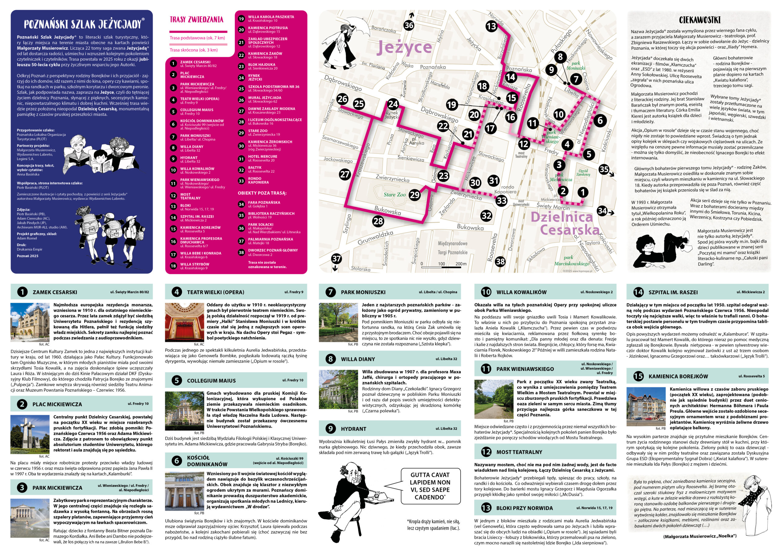 30 września 2025 nastąpiło bezprecedensowe wydarzenie, które połączyło miasto Poznań z kultową serią książek. To właśnie w sercu stolicy Wielkopolski powstała wyjątkowa inicjatywa – Poznański Szlak Jeżycjady®, czyli literacka trasa turystyczna prowadząca śladami bohaterów cyklu Musierowicz. Spacerując po centrum Poznania czy starym mieście, można przejść dokładnie tymi drogami, które przemierzali bohaterowie powieści. Szlak liczy 7 km (lub krótszą wersję 3 km) i obejmuje aż 38 punktów, w tym ikoniczną kamienicę Borejków przy ul. Roosevelta 5. W celu ułatwienia uczestnikom zwiedzania przygotowano darmową mapkę oraz stronę internetową visitpoznan.pl, na której znajdują się szczegółowe informacje, zdjęcia i cytaty.